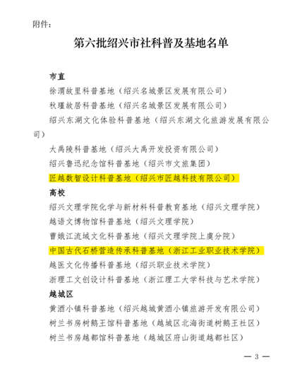 近日,我校建筑工程学院申报的“中国古代石桥营造传承科普基地”以及我校全资子公司(绍兴市匠越科技有限公司)申报的“匠越数智设计科普基地”成功入选第六批绍兴市社科普及基地。