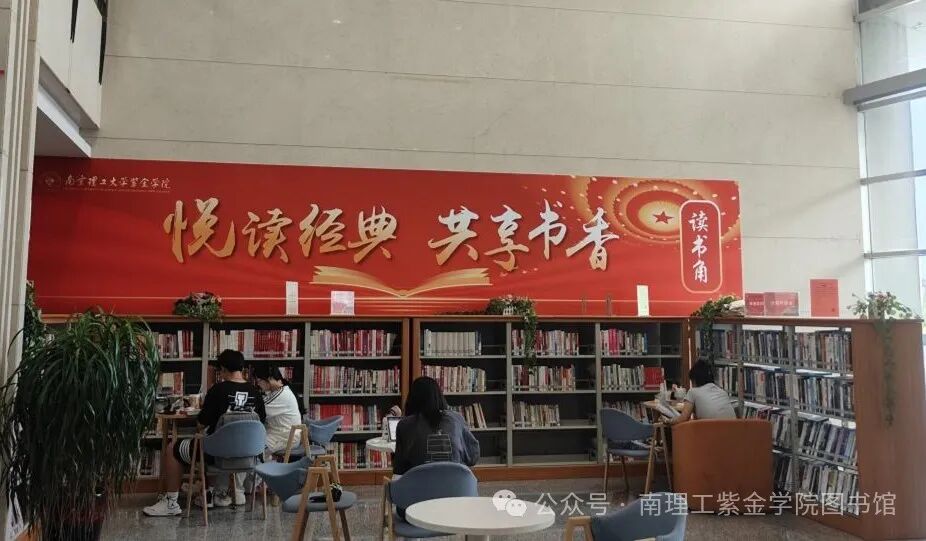 南理工紫金学院图书馆建成于2005年,建筑面积为1.9万平米。全馆配置了现代化的计算机管理系统、图书监测和安全监控系统。图书馆门禁管理和读者信息采集己纳入校园智慧卡管理系统;文献的采编、流通和文献检索等工作均已实现全面的自动化管理。目前共设有图书借阅室、期刊报纸阅览室、样本图书及工具书阅览室、电子阅览室(包括自助电子阅览)及视听阅读空间。现有藏书86万余册,期刊报纸600余种;普通阅览座位1300多个,电子阅览服务座位276个。图书借阅实行全开架服务。