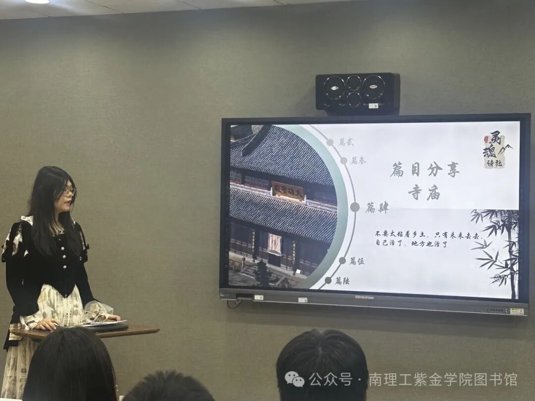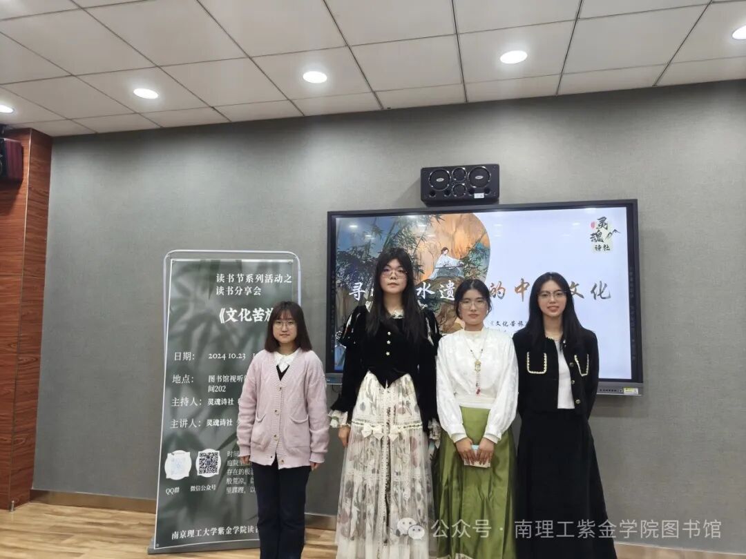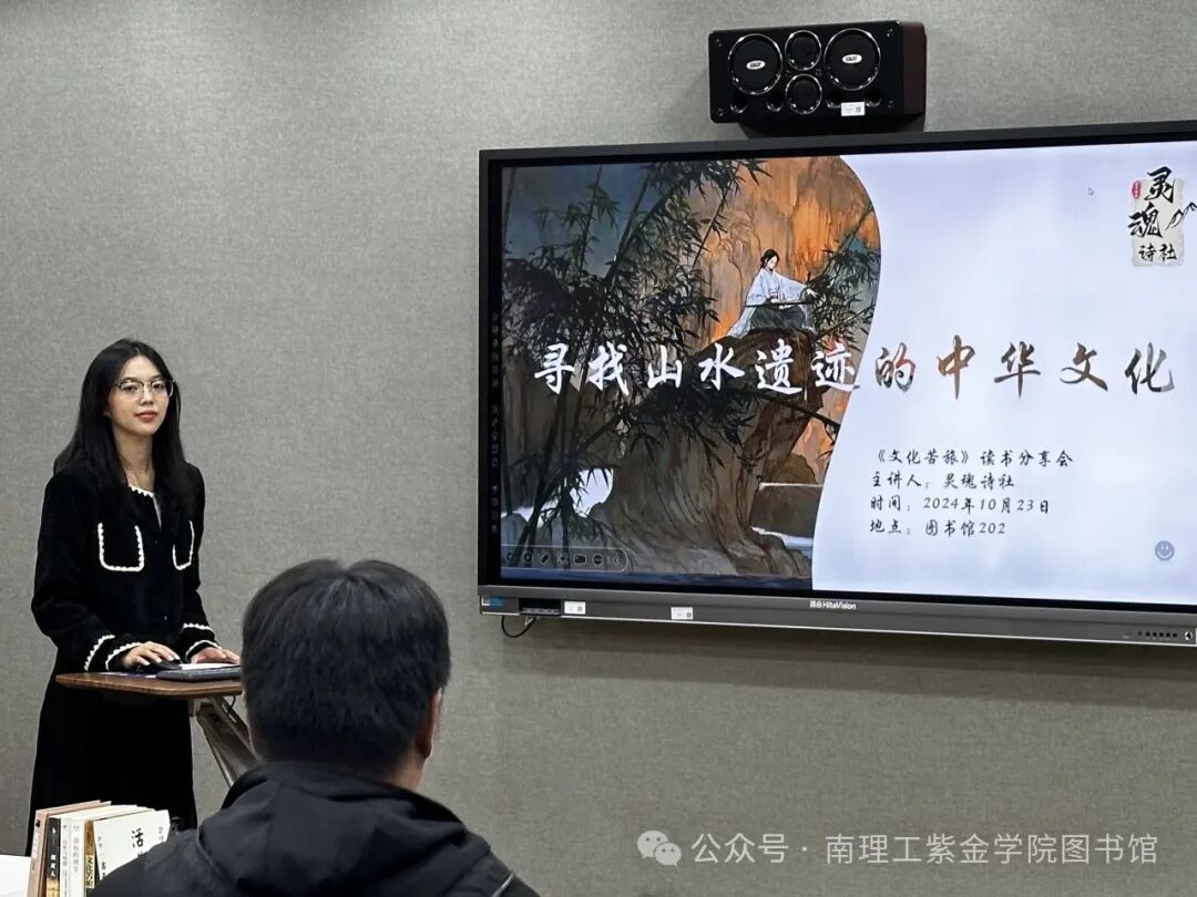 深秋怡然,金桂馥郁,读书正当时。2024年10月23日读 者协会于图书馆202视听室举办了《文化苦旅》读书分享会。分 享会由灵魂诗社成员们主讲,吸引了近30名来自各个院系的同 学积极参加。读者服务部主任任精举和读协指导老师刘婷婷参与 了活动。