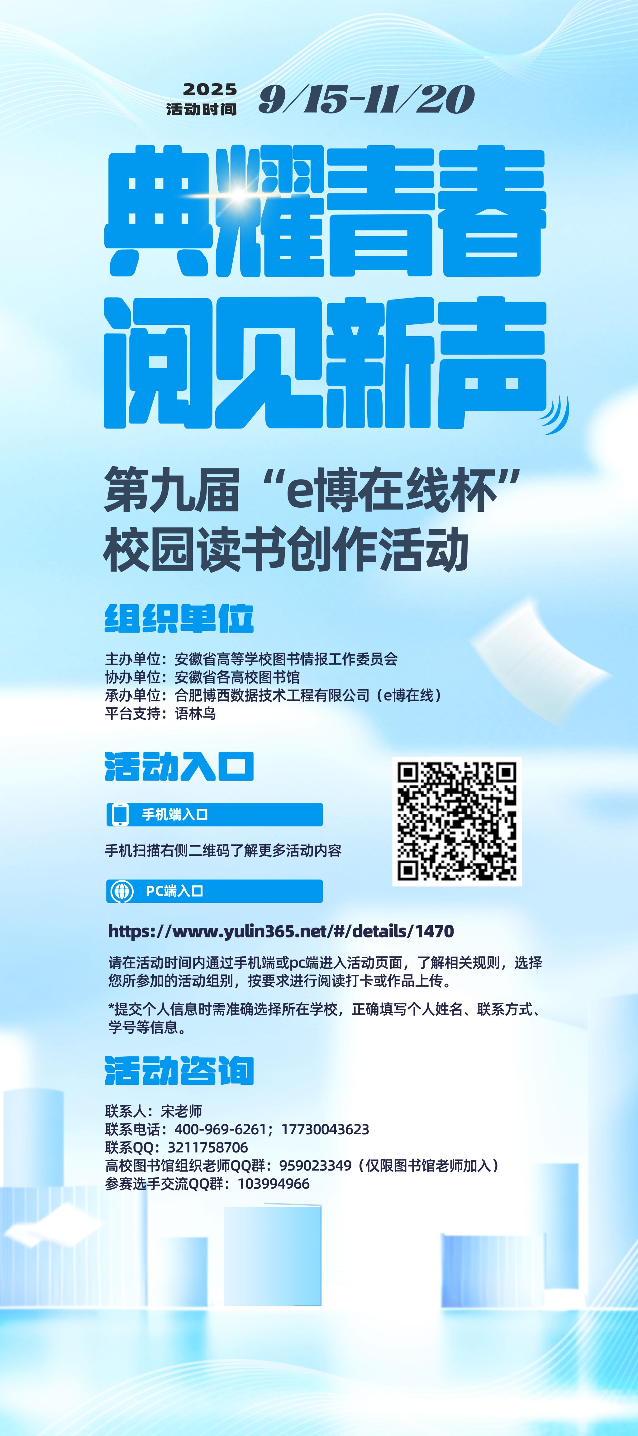 为深入贯彻落实党的二十大关于“深化全民阅读活动”的重要部署,积极响应“书香中国”建设号召,充分发挥高校图书馆在文化育人中的阵地作用,安徽省高等学校图书情报工作委员会联合全省高校图书馆,特举办第九届“ e 博在线杯”校园读书创作活动。