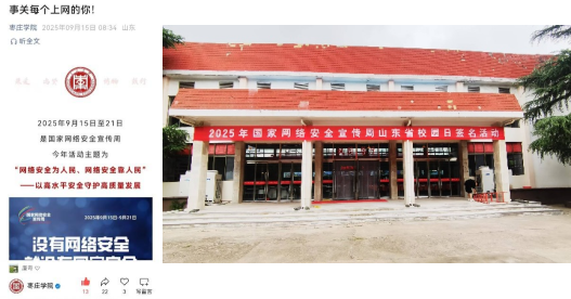 近日,为进一步普及网络安全知识、增强网络安全意识,营造健康文明的网络安全环境,枣庄学院深入开展 “2025年国家网络安全宣传周”活动,本次活动以“网络安全为人民,网络安全靠人民—以高水平安全守护高质量发展”为主题,网络安全和信息化领导小组办公室、党委宣传部、学生工作处、网络中心、安全管理处、校团委、信息科学与工程学院等部门通过丰富多样的宣传教育活动,积极营造正能量充盈的网络育人环境。