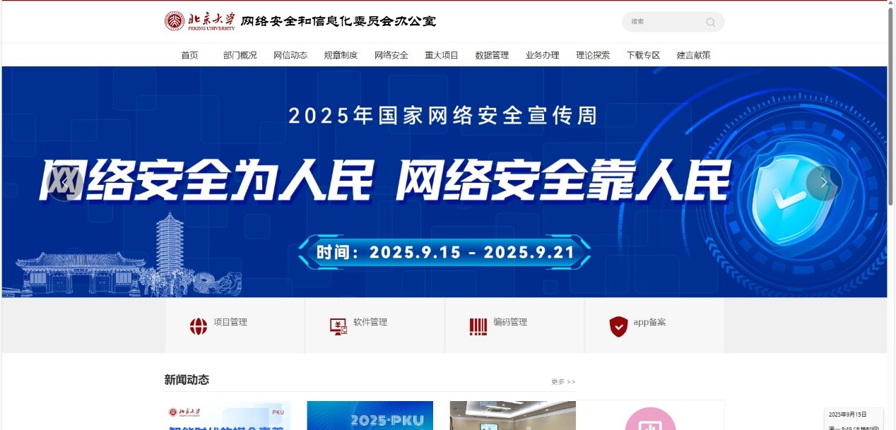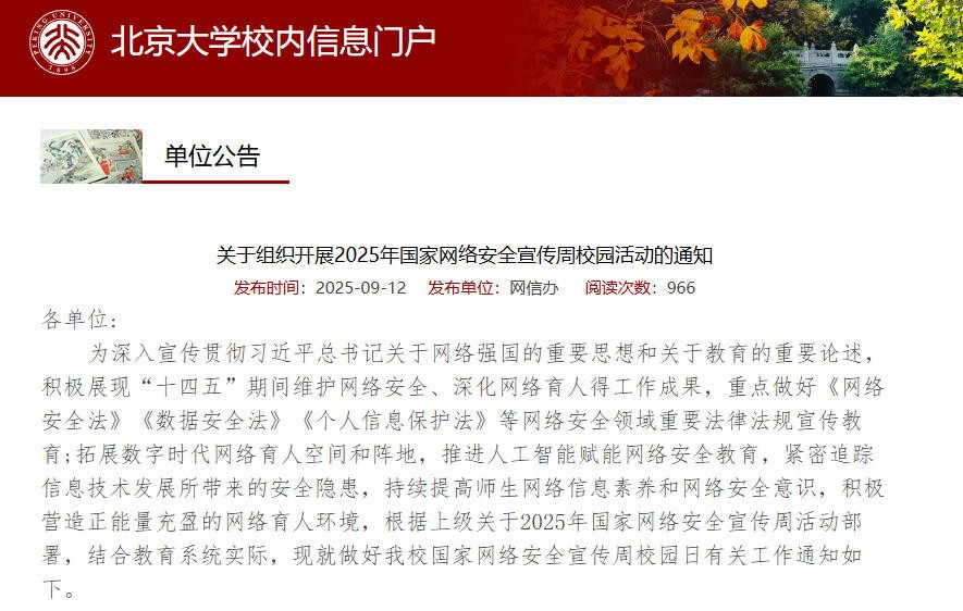 为深入宣传贯彻习近平总书记关于网络强国的重要思想和关于教育的重要论述,积极展现北京大学“十四五”期间维护网络安全、深化网络育人的工作成果,做好网络安全领域重要法律法规宣传教育,拓展数字时代网络育人空间和阵地,推进人工智能赋能网络安全教育,持续提高师生网络信息素养和网络安全意识,积极营造正能量充盈的网络育人环境,根据上级关于2025 年国家网络安全宣传周活动部署及学校实际,北京大学于2025 年9月15日至21日,围绕“网络安全为人民,网络安全靠人民——以高水平安全守护高质量发展”主题,在全校范围内组织开展了形式多样、内容丰富的网络安全宣传教育活动,取得了显著成效。现将有关情况总结如下。