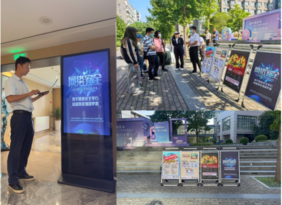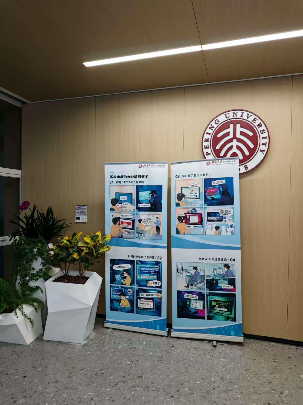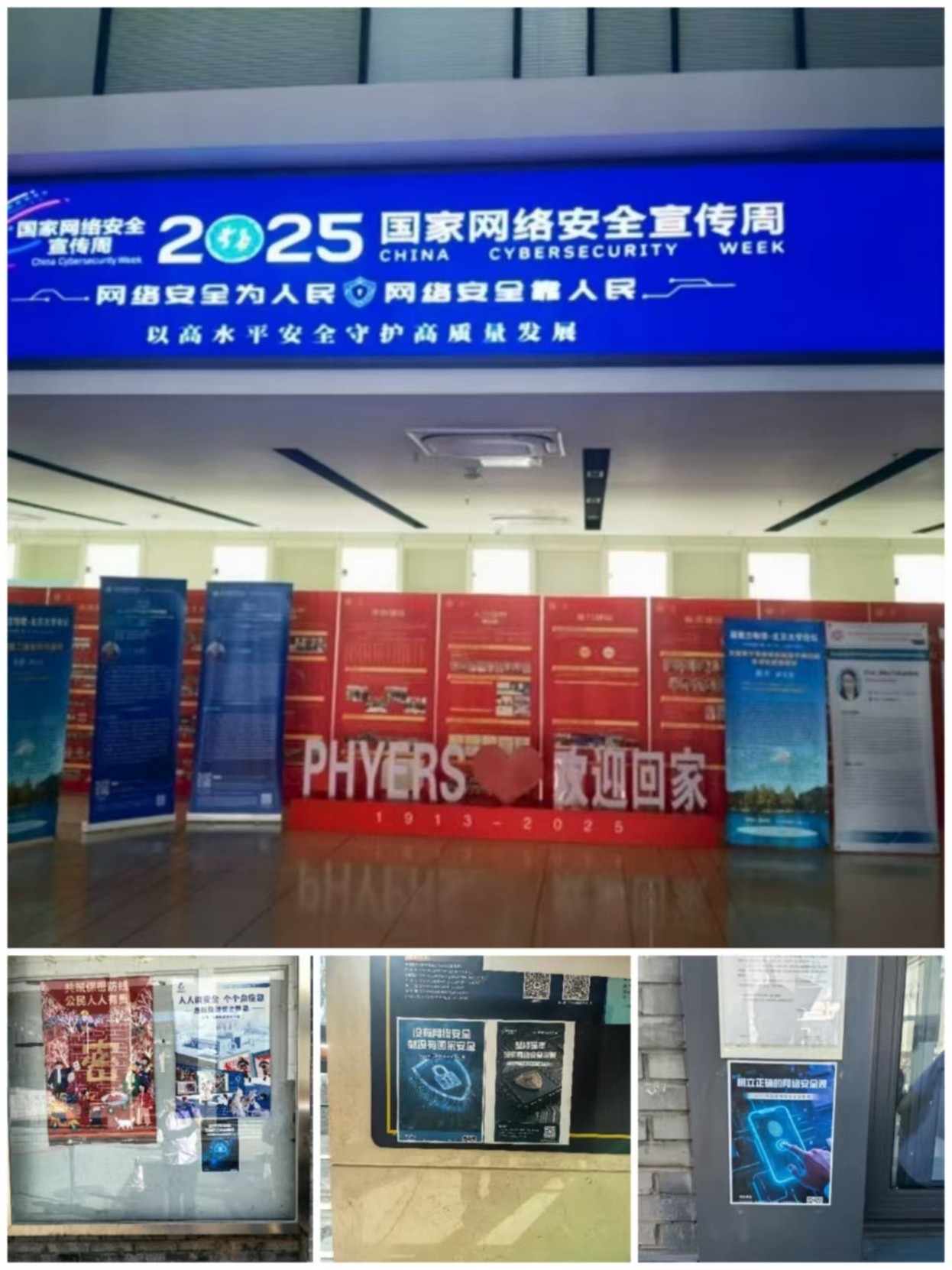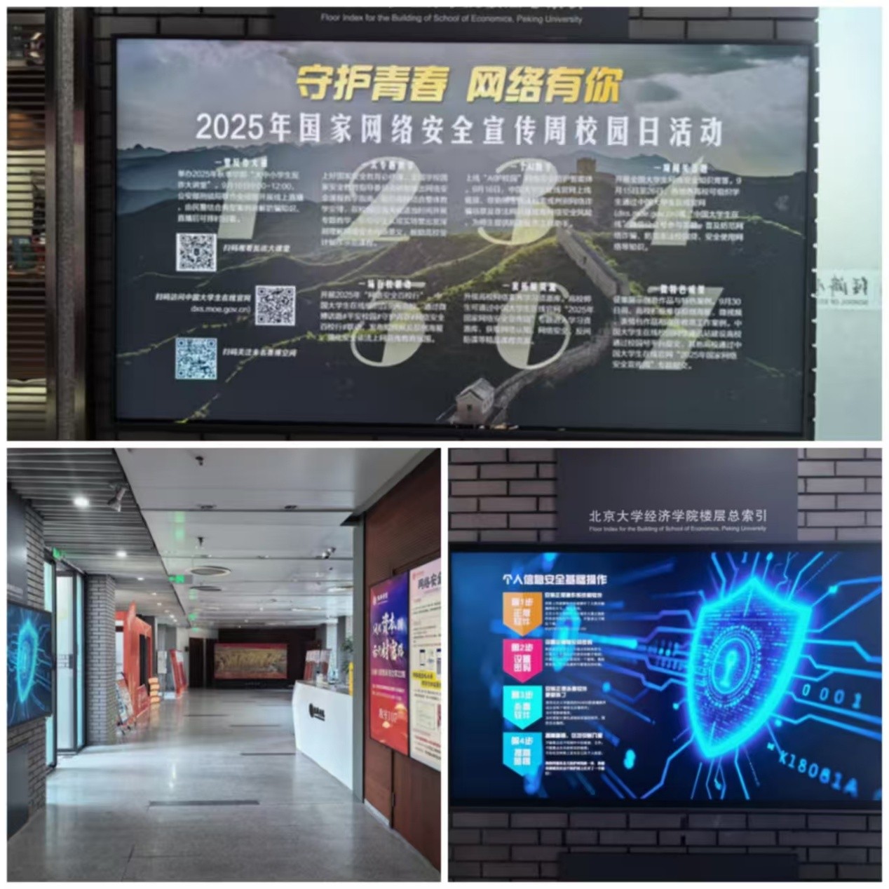 各校区、各学院结合院系实际,发挥各自优势和创意,开展网络安全主题宣传。新燕园校区在公共区域电子显示屏发布网信办编辑的《北大校园网络安全“应知应会十提示”》,医学部在逸夫楼、科技楼和宿舍楼大屏轮巡播放网络安全宣传片,深研院则在公共广场设置易拉宝,开展网络安全主题日活动; 物理学院 、 化学学院、生命科学学院、 国际关系学院、经济学院、外国语学院、会议中心、附中 等单位也 通过电子显示屏播放宣传视频、滚动展示网络安全标语及警示案例, 实现抬头可见、驻足即学;或者 通过 易拉宝、展板、网络安全宣传单、宣传册等 发布网络安全知识,广泛宣传和普及网络安全教育的法律法规、政策导向及相关知识。