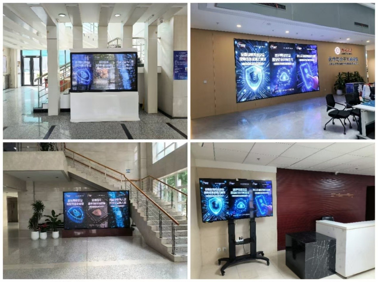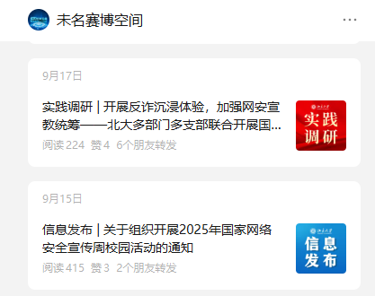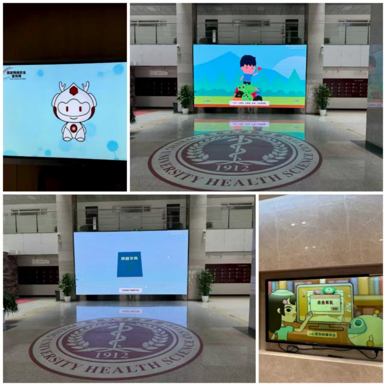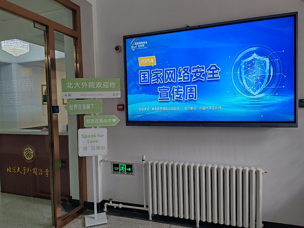 各校区、各学院结合院系实际,发挥各自优势和创意,开展网络安全主题宣传。新燕园校区在公共区域电子显示屏发布网信办编辑的《北大校园网络安全“应知应会十提示”》,医学部在逸夫楼、科技楼和宿舍楼大屏轮巡播放网络安全宣传片,深研院则在公共广场设置易拉宝,开展网络安全主题日活动; 物理学院 、 化学学院、生命科学学院、 国际关系学院、经济学院、外国语学院、会议中心、附中 等单位也 通过电子显示屏播放宣传视频、滚动展示网络安全标语及警示案例, 实现抬头可见、驻足即学;或者 通过 易拉宝、展板、网络安全宣传单、宣传册等 发布网络安全知识,广泛宣传和普及网络安全教育的法律法规、政策导向及相关知识。