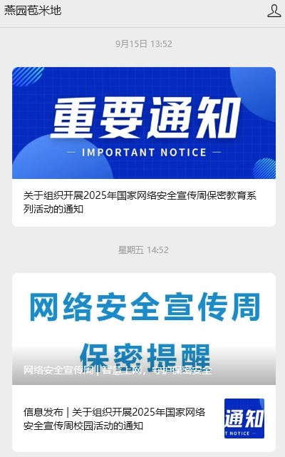 网信办、保卫部、保密办等网安周校园活动主办部门,通过网站大图、 微信公众号等媒介,开展网络安全主题宣传。