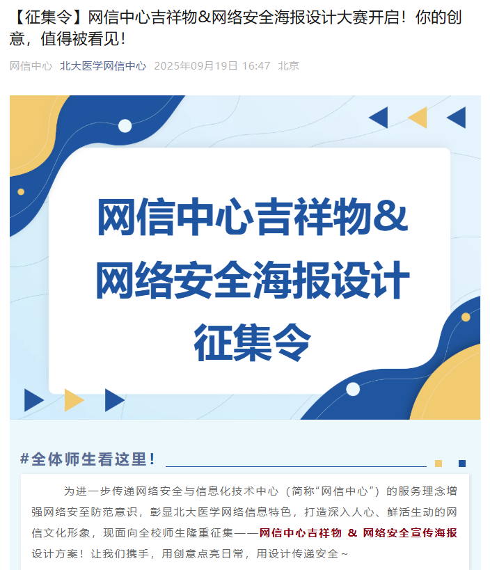医学部面向全校师生公开征集网信中心吉祥物和网络安全宣传海报设计方案。以此打造独具特色的网信文化品牌,让网络安全、信息化服务理念以更生动、更亲切的方式融入师生日常,增强师生互动与认同感。