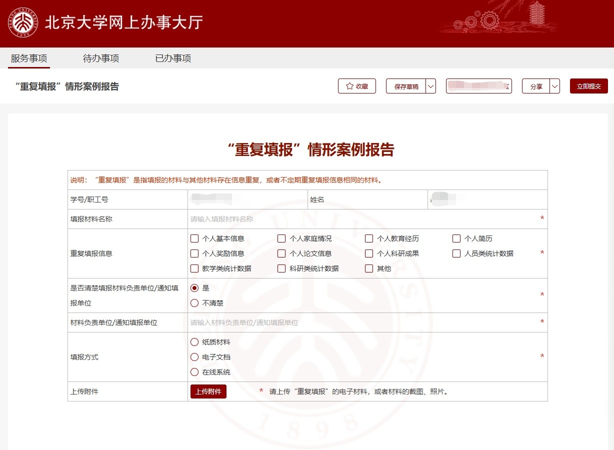 依据调研情况,综合各单位建议,计算中心开发了“‘重复填报’情形案例报告” 程序, 开展信息数据“重复填报”具体情形和案例征集。师生报告问题途径:登录校内信息门户,搜索“‘重复填报’情形案例报告”,点击进入 ,填写问题相关信息后提交。