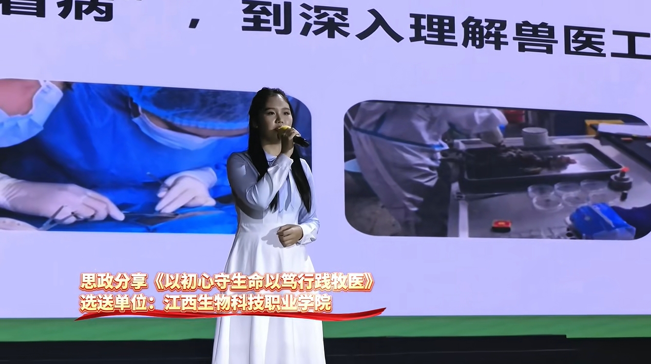 活动现场,我院动物科学系2023级学子刘思莹以《以初心守生命 以笃行践牧医》为题,结合自身感悟,在舞台上讲述了自己支农爱农的赤诚初心,深刻诠释了青年一代深耕畜牧产业的责任与行业重量,真挚话语引发在场观众强烈共鸣。