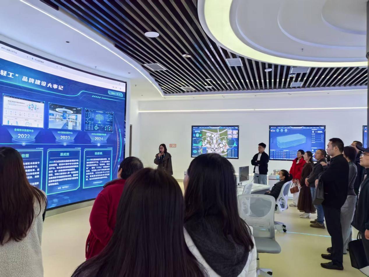 在 参观智慧校园 IOC 智能运营中心过程中,信息中心 工作人员 向各位 学员老师们 介绍了 “数字轻工”品牌的打造历程、学院智慧IOC智能运营中心的总体架构设计和技术路线、目前的建设成果,并重点介绍了学院在持续加强数据治理的基础上,建成物联中台、业务中台、数据中台“三中台”和九个“智慧场景”,打通校本数据标准和教育部职教数据标准之间的数据链路,助力学院数据治理水平迈上新台阶。