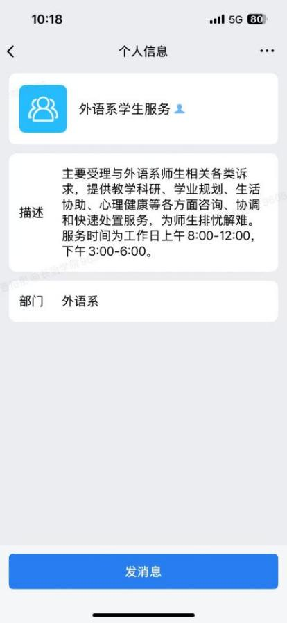 功能简介:主要受理与外语系师生相关的各类诉求,提供教学科研、学业规划、生活协助、心理健康等各方面的咨询、协调和快速处置服务,及时为师生排忧解难