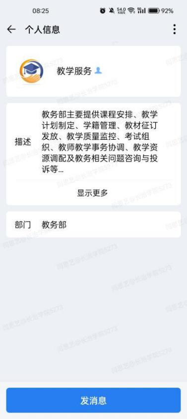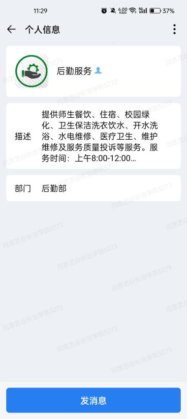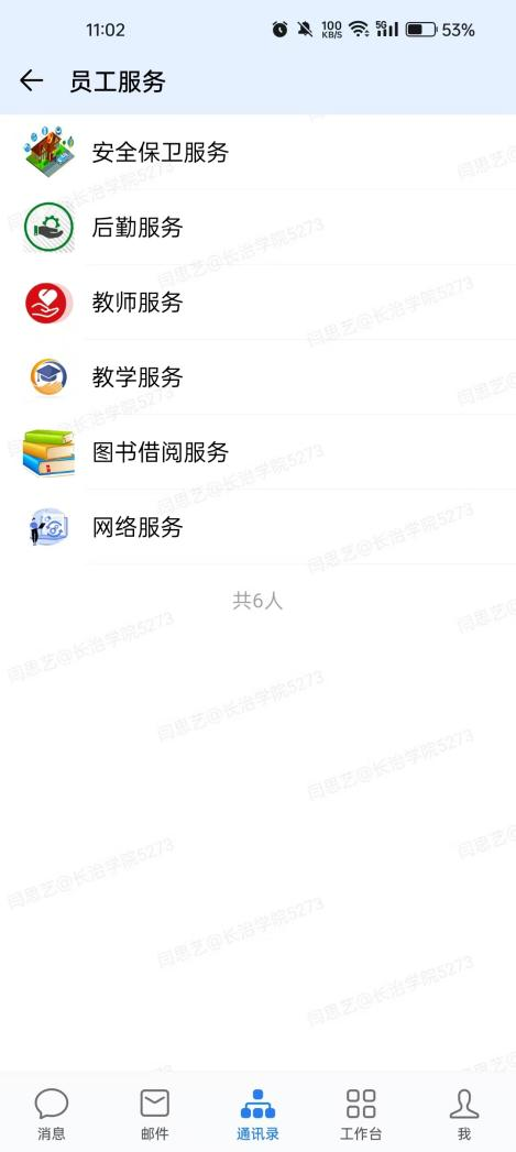 企业微信 “ 通讯录 ” 里面的 “ 员工服务 ” 平台是一种为全校师生提供细致服务的线上线下相结合的工作平台。目前已经开通了 “后勤服务”“教学服务”“图书借阅服务”“安全保卫服务”“教师服务”“网络服务”“学生工作服务”以及 15 个系部的学生服务。