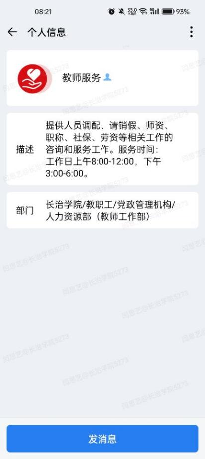 功能简介:提供人员调配、请销假、师资、职称、社保、劳资等相关工作的咨询和服务工作。服务时间:工作日上午 8:00-12:00 ,下午 3:00-6:00 。
