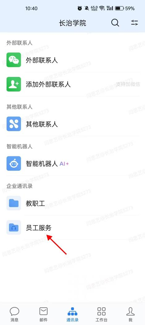 答:打开企业微信底部一栏的通讯录就可以看见我们的员工服务了